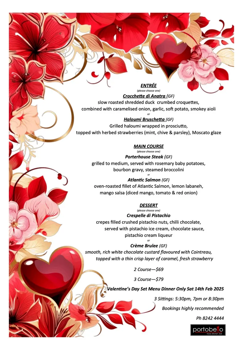 Valentine's Day Sat 14th Feb Special Dinner Menu. 3 Sittings 5:30, 7pm or 8:30. Bookings 8242 4444